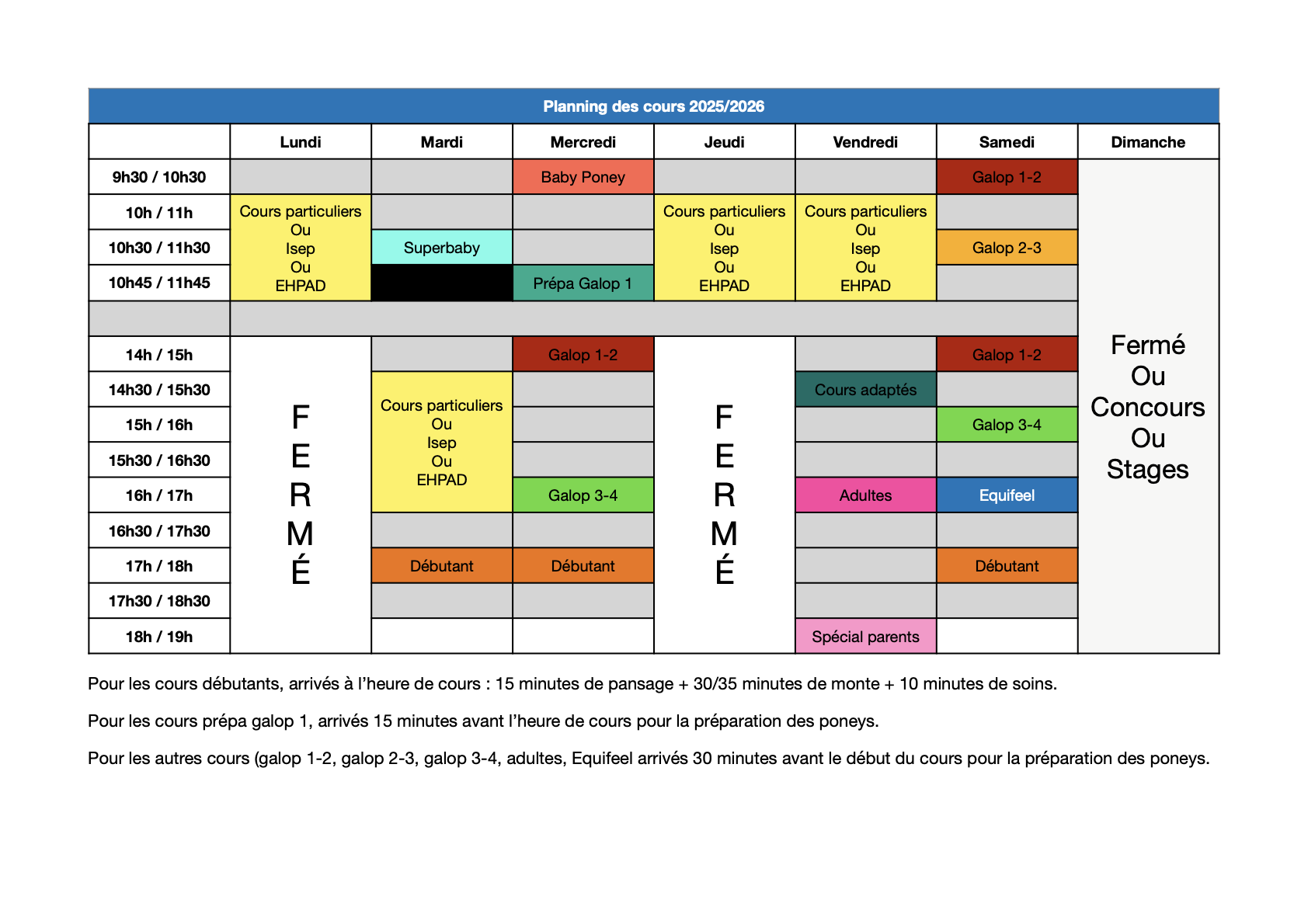 Durant toute l’année, les cours varient chaque semaine : dressage, saut, mise en selle et travail à pied. Pour les cours baby poney et les débutants on alterne entre équifun et travail à pied.